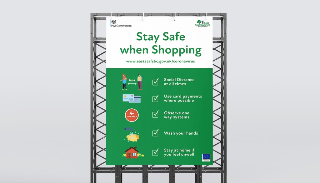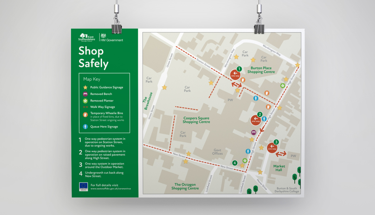 When the pandemic hit East Staffordshire Borough Council needed clear, easy to understand graphics and signage throughout Burton upon Trent and Uttoxeter. These were required to keep both residents and businesses as safe as possible. With lockdown forcing everyone to stay at home animations were produced for residents to stay informed.